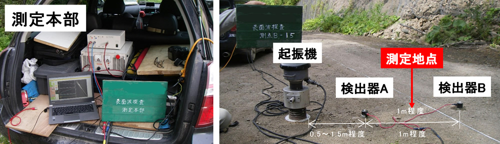 - 斜面調査や断層調査が可能で、表面波探査としては探査深度が深い。