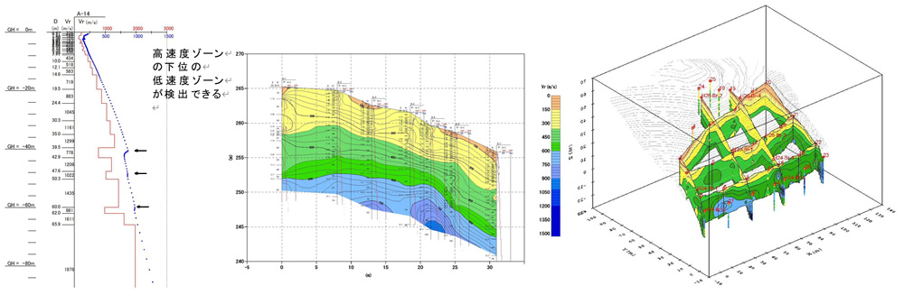 - そのため、地すべりや斜面の緩み領域の探査が可能。また、熱水変質帯や断層の調査も可能。