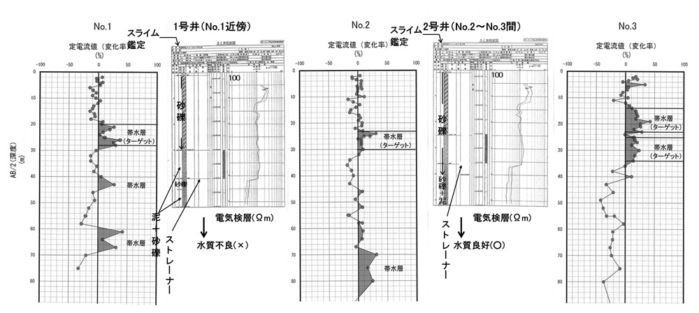 定電流値が変化率正の部分を帯水層と認定。しかし、2つのボーリング工事ではこれと関係なく、電気検層の高比抵抗部底にストレーナーを入れた。この結果、1号井は電流値が低い泥混り層に入れて失敗、一方2号井は成功したが、砂礫層で電流曲線もNo.1~No.3を通じて帯水層にかかっていた。