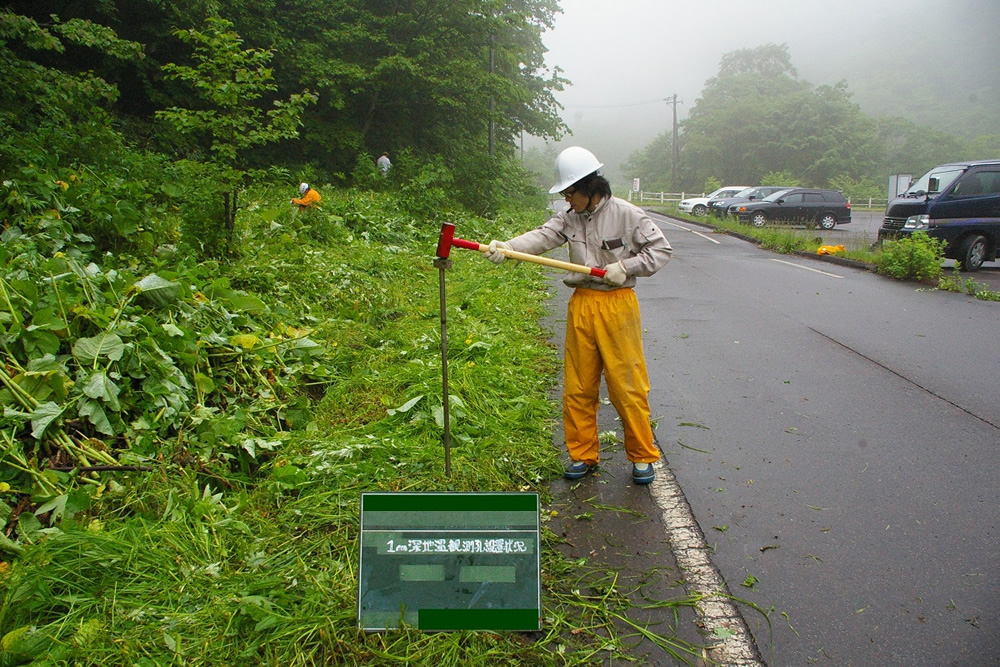 地中に長さ1mの鉄棒を打ち込み、狭い穴を開ける。測定孔を穿孔後24時間以上放置してから、孔底のガスを100ml採取し炭酸ガス検知管により測定する。