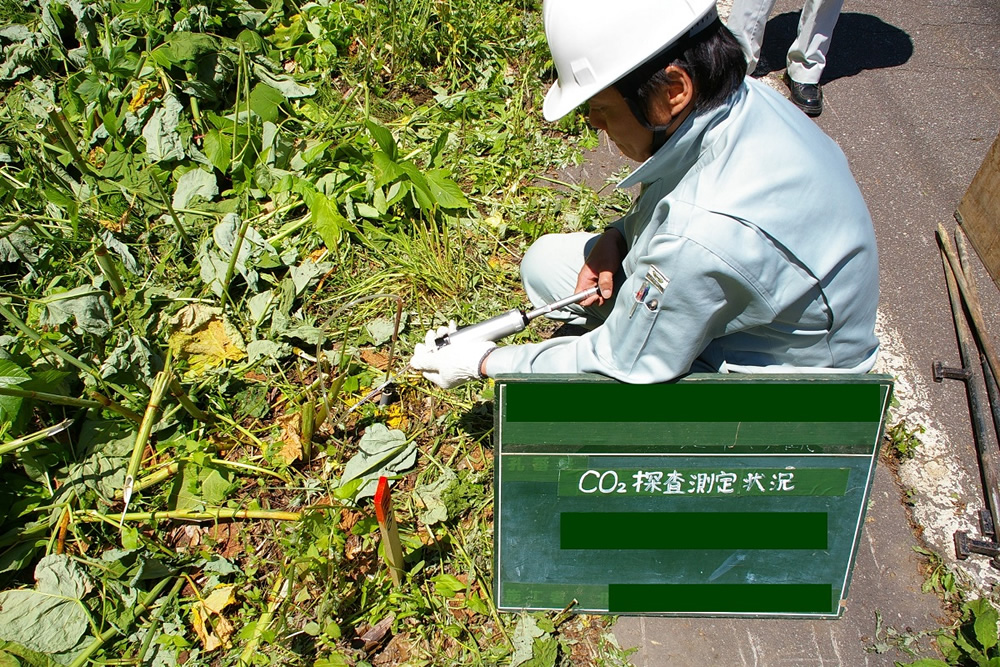 調査地の地質学的状況に応じ、各測定孔ごとのガス濃度のレンジに対応する精度の検知管を使用する。なお、現場測定用の検知管は、ガス濃度0.05%以下は検知できないので、測定値0.00%は通常の大気中濃度(約0.03%)とする。