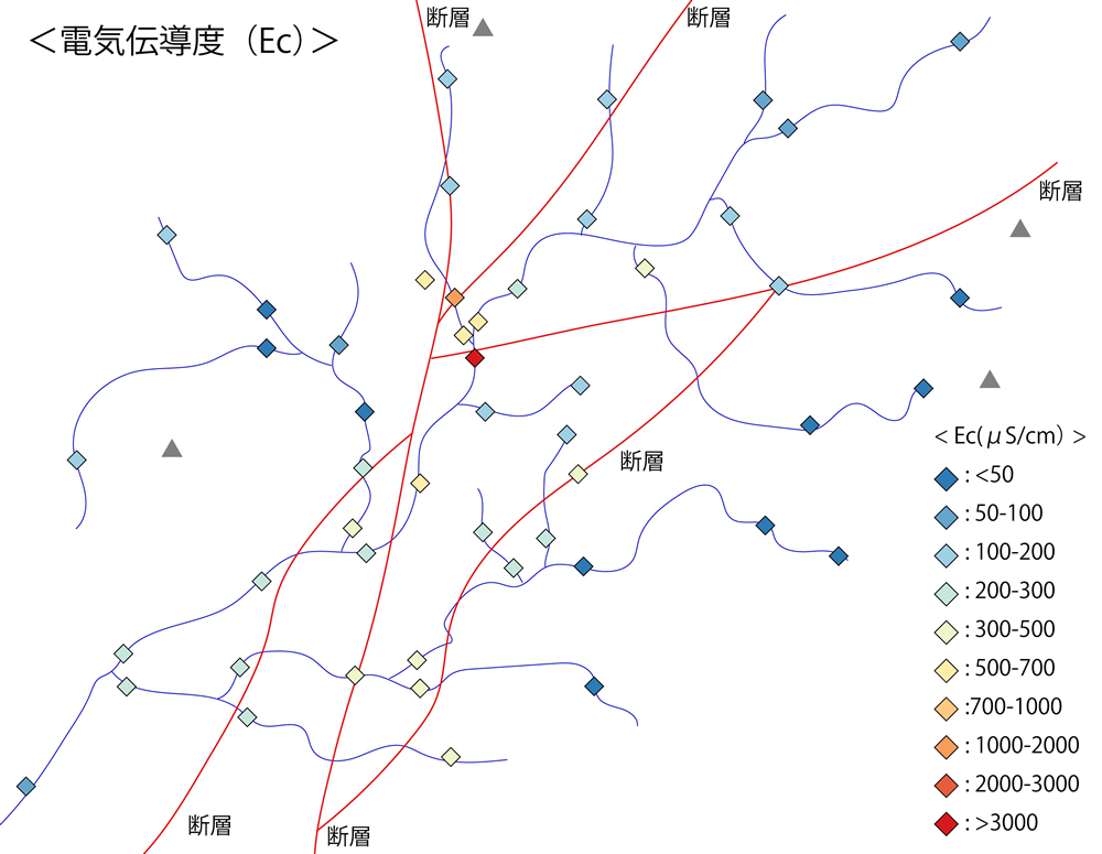 データは水質分布図などとして表現しますが、これと踏査によって得られた、変質区分や断層の入った図等を総合して、地熱構造の解析に役立てます。