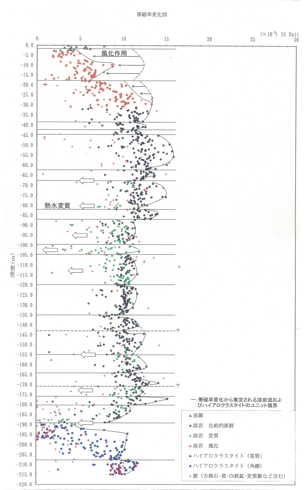 岩相,熱水変質,風化作用に伴って、帯磁率が変化する。